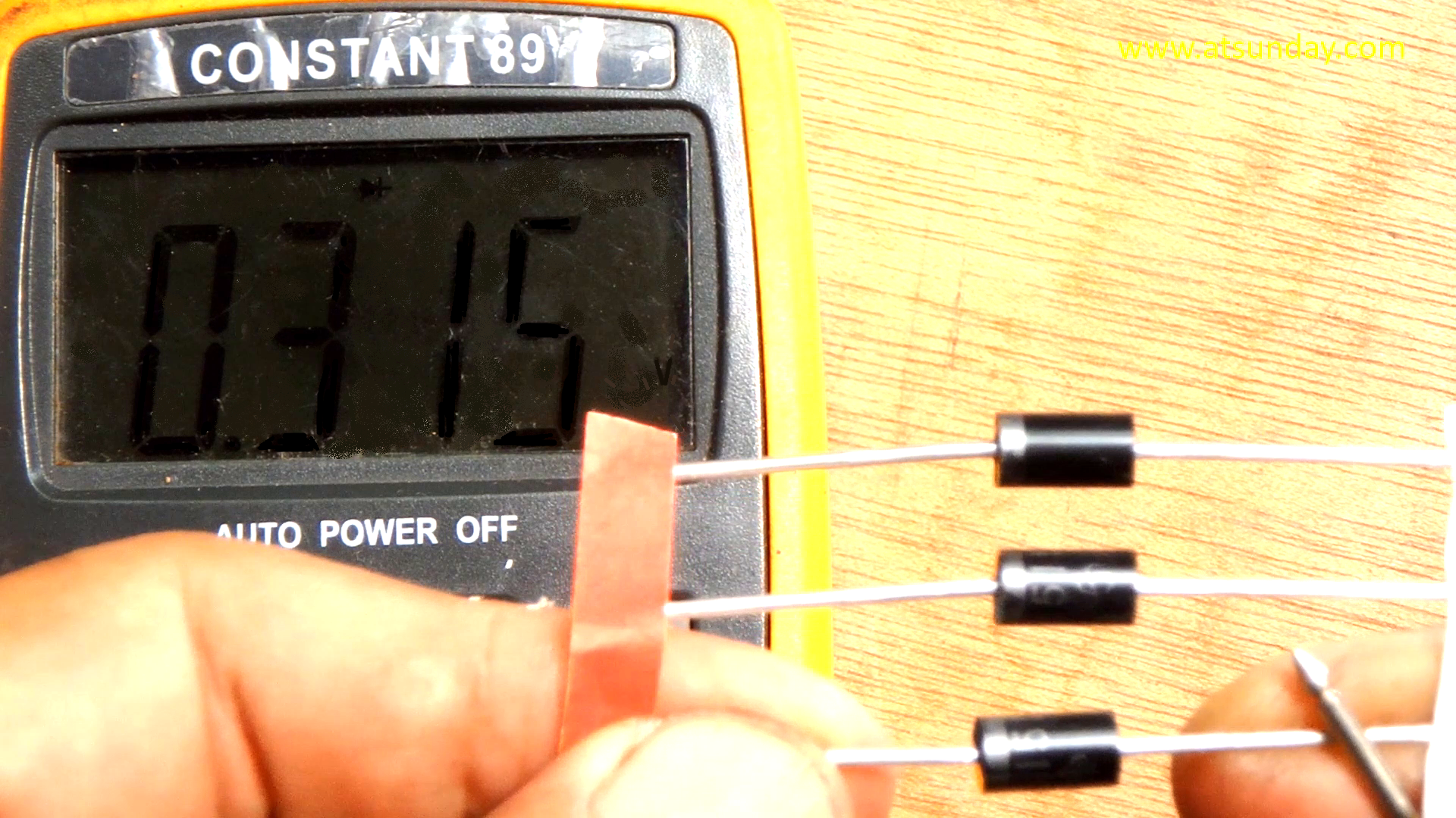 The voltage specification for this diode, if given a reverse current, is zero volts. If a forward current is applied, the voltage is around 0.15 to 0.45 volts, in the video it reads 0.315 volts.